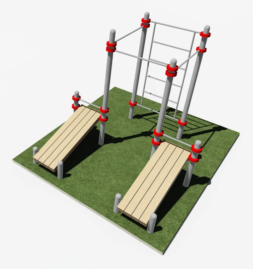 К четырем опорным столбам высотой: 3 шт. – 2600 мм, 1 шт. – 2300 мм крепится шведская сетка на высоте 2450 мм и три перекладины турников длиной 1200 мм на высоте 2300мм, 2200 мм, 2000 мм.