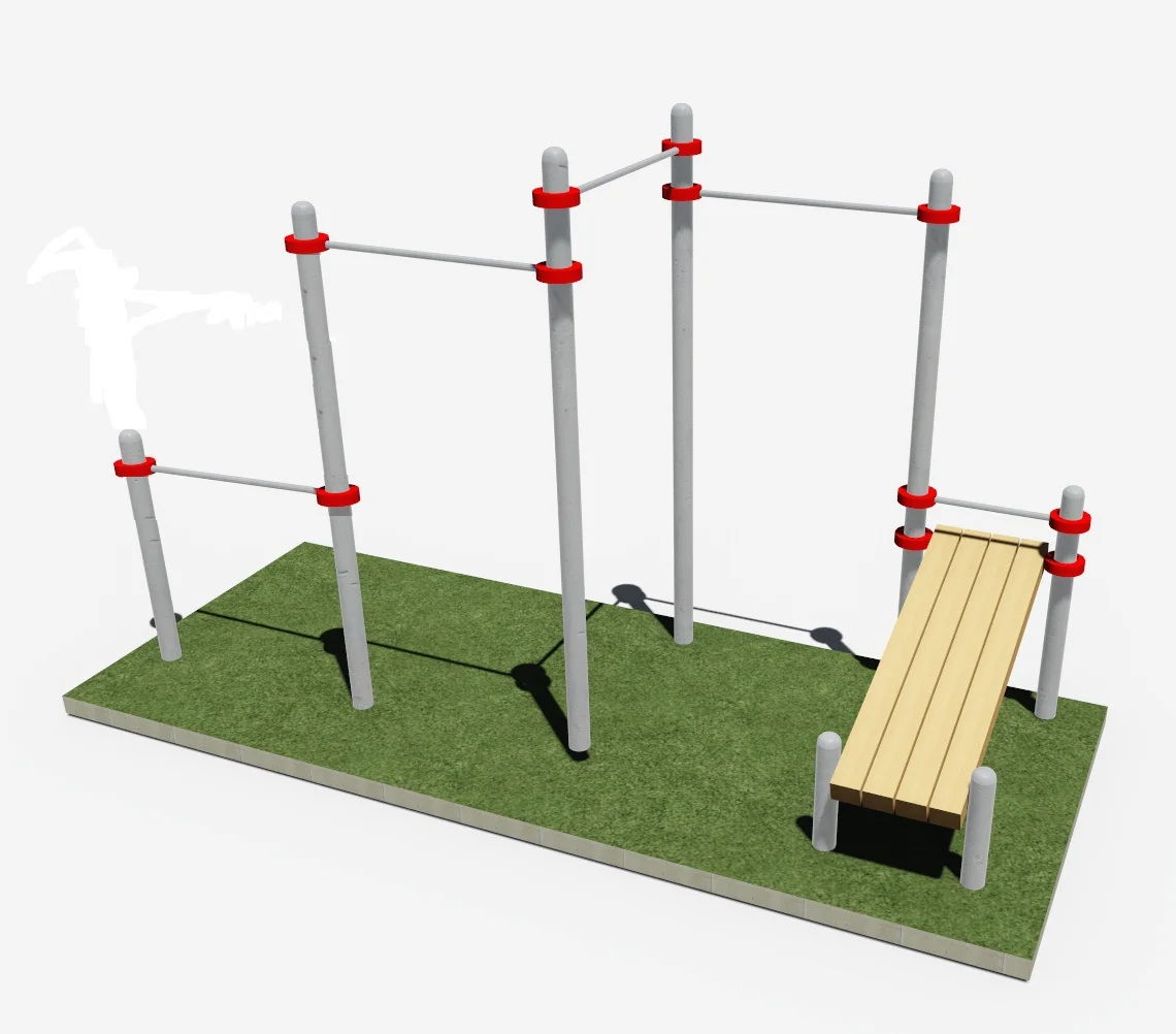 Составляющими данного комплекса являются скамья для пресса, турники для подтягиваний и турник для отжиманий.