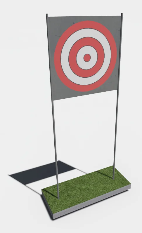 Опорные столбы высотой 2700 мм в количестве 2 единиц, диаметр которых составляет 34 мм, стальной щит размером 1000 мм*1000 мм, на который нанесена «разметка цели». Расстояние от поверхности основания до нижнего края щита 1700 мм. Щит крепится к стойкам болтовым соединениям. Рамка для щита представляет собой металлический уголок. Диаметр цели – 90 см.
